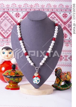 Russian symbols matryoshka, balalaika, rubles cash and flag of russian federation on wooden background.