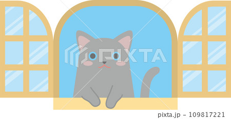 窓の外を見る猫のイラスト_窓からちょこんと手を出して覗く猫_ロシアンブルー