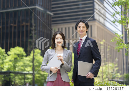 カメラ目線で笑顔の男女2人の30代のビジネスパーソン