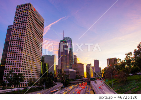 ダウンタウン、ロスアンゼルス、ビル群、夕焼け