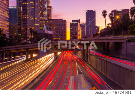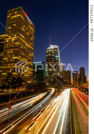 ダウンタウン、ロスアンゼルス、ビル群、夕景と車の光跡