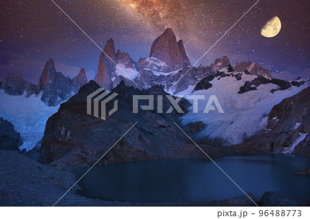 パタゴニア地方のフィッツロイ山にかかる月