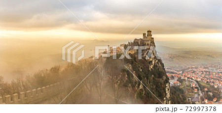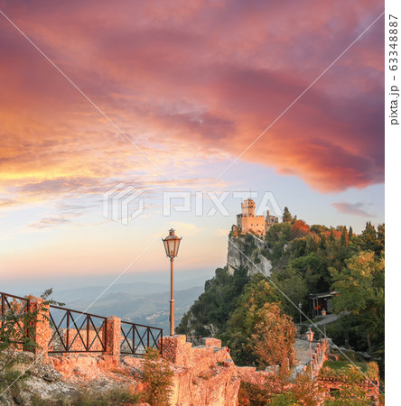 Castle Rocca della Guaita against sunset in San Marino republic, Italy