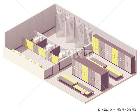 ロッカーが並ぶ学校の更衣室のシンプルでかわいいアイソメトリック線画イラスト
