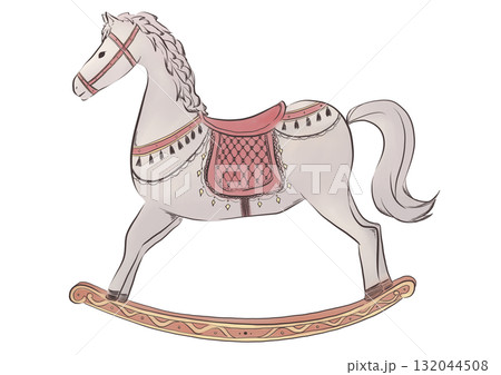 An illustration of a cute beige toy rocking horse with pink saddle.
