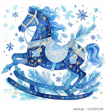 Beautiful rocking horse design in shades of blue with snowflakes and pine, perfect for winter decor