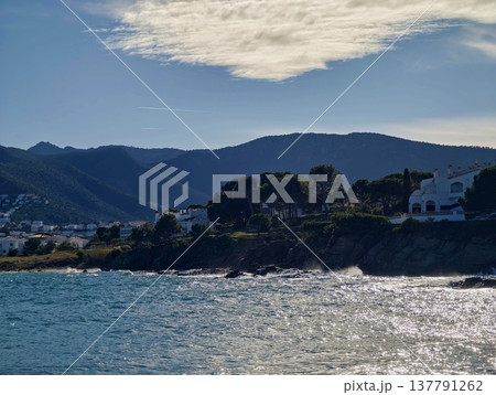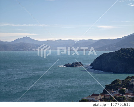 Rocky Promontory With Distant Peaks, Beachfront Village With Mountain Background And Tranquil Sea