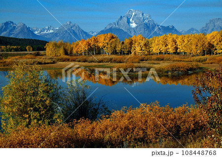 アメリカ合衆国 グランド・ティトン国立公園の秋 湖水に映る黄葉