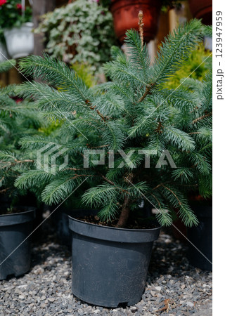 Variety of plants and flowers at flower market, selective focus on flowers. Garden center for the sale of plants.