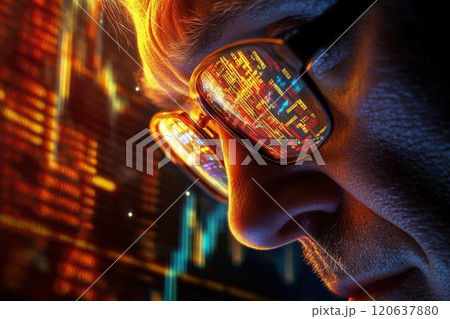 A man wearing glasses is looking at a computer screen with a lot of numbers
