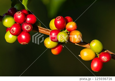 Close-up of colorful coffee cherries in different ripening stages on a branch, highlighted by natural sunlight in a coffee plantation.