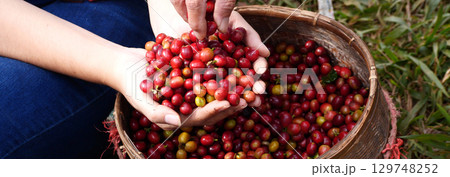 Banner hands harvest red seed in basket robusta arabica plant farm. Coffee plant farm Close up woman Hands harvest raw coffee beans. Ripe Red berry plant fresh seed coffee tree growth with copy space