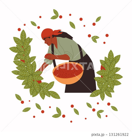 Farmer at plantation. Local farm. Woman picking coffee. Gardener harvesting natural berries into basket. Plant leaves. Crop organic cultivation. Farming product. Arabica beans growing. Vector concept