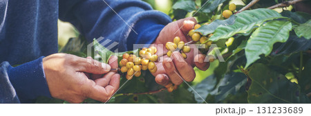 Banner Man Hands harvest Yellow Bourbon coffee bean ripe berries plant fresh seed coffee tree growth in green eco organic farm. Close up man hands harvest yellow bean robusta arabica with copy space