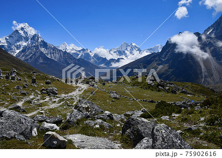 ネパールのトゥクラとロブチェ間の絶景とトレッキングする人