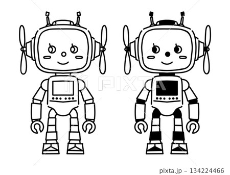 かわいいロボットの白黒ベクターイラスト(線画と塗りあり)