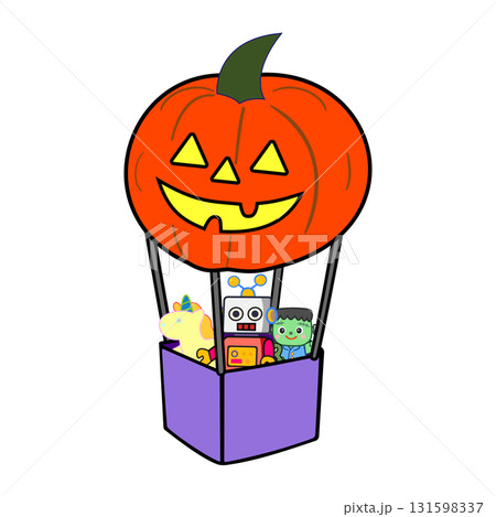 カラフルなかぼちゃの気球に乗った可愛いぬいぐるみのイラスト素材