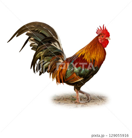 Jungle Fowl displaying vivid orange blue and green plumage with a proud stance isolated on a clean white background
