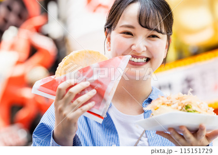 大阪道頓堀で名物のたこせんを食べる女性