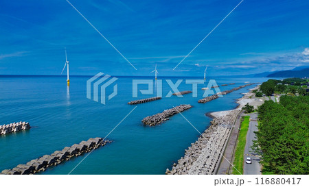 富山県入善町海岸線の洋上風力発電設備などの様子