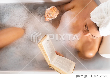 A young beautiful woman lies in a bath with white foam. Reading a book and enjoying a bath.