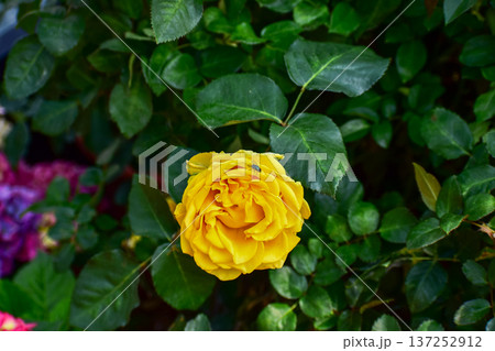 Close-up of yellow rose in the garden with sunlight on it. Yellow rosa with green leaves in the afternoon in rural. Flower and plant.