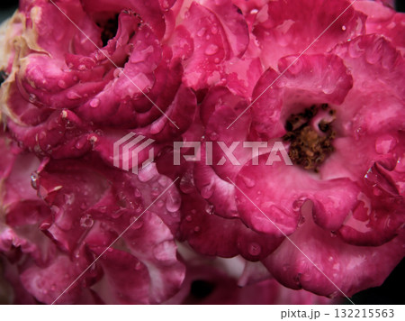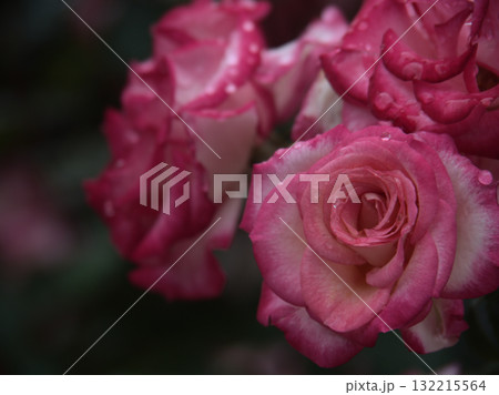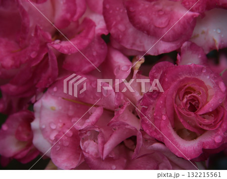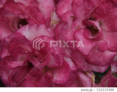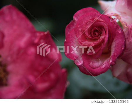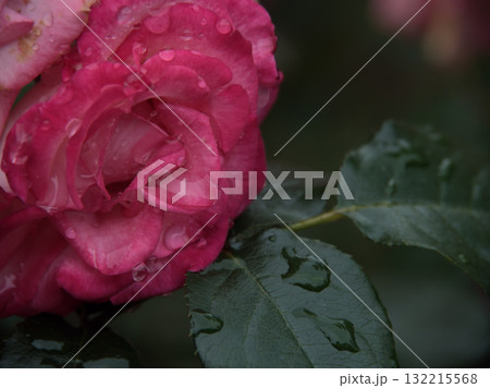 大雨の6月に美しく咲いたピンク色のバラの花「ローゼ 21」