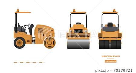 Vibratory roller in realistic style. Side, back and front view. Building machinery 3d image. Industrial isolated drawing of orange asphalt compactor. Diesel vehicle blueprint