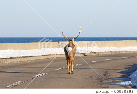 野付半島の道路を横断するエゾシカ[冬]/オス成獣(B・2‐1)
