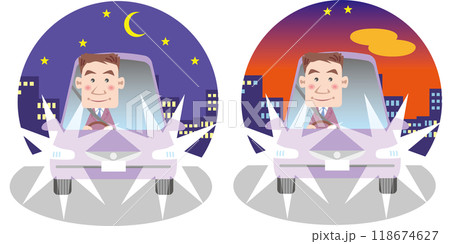 交通安全<夕方と夜のヘッドライト点灯で安全運転・ビジネスマン>
