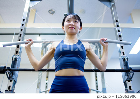 ジムで体を鍛える女性 ラットプルダウン 筋トレ女子 ワークアウト 正面