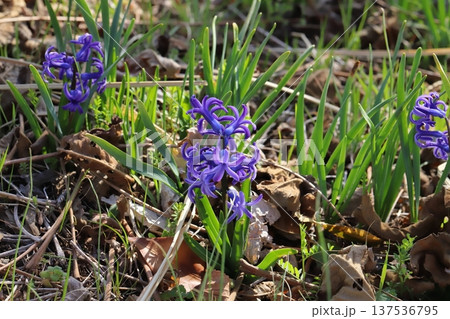 早春の野原に咲く青紫色のローマン系ヒアシンスの花