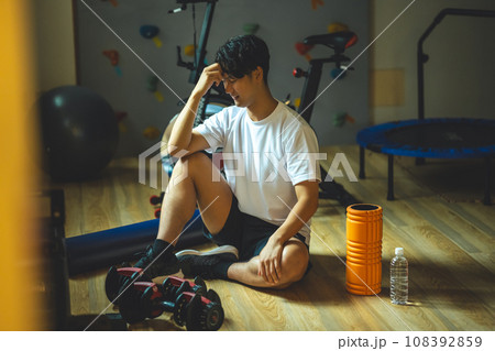 スポーツジムでアブローラーを使い腹筋をトレーニングしているアジア人男性