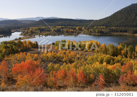 アメリカ合衆国 秋のグランドティトン国立公園 ティトン山脈 スネイク川