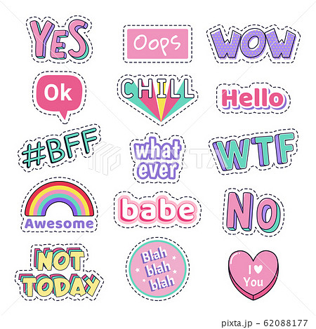 Teenage speech patch stickers. Girls fashion funny text patches. Oops, Wow, Omg cute doodle teenage pop art sticker, vector illustration icon set