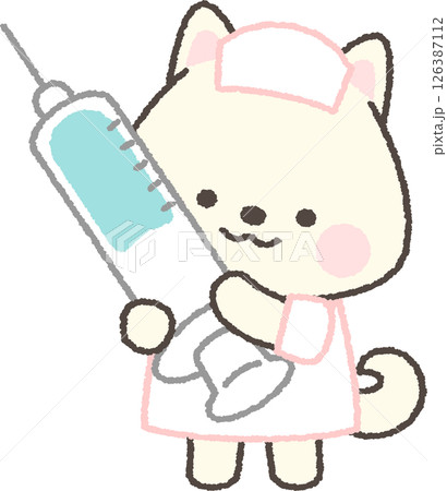 注射器を持つ白い柴犬の看護師