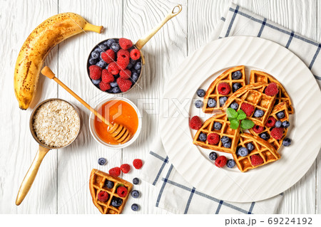 Sugar free waffles with banana and oatmeal, and ingredients for their preparation on a white table, healthy eating and gluten free breakfast concept, top view with copy space