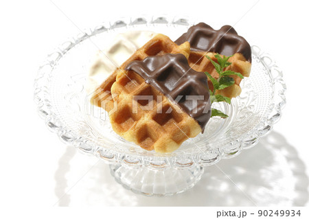透明なガラス製のケーキスタンドに盛り付けられているチョコがコーティングされたワッフルを白背景で撮影