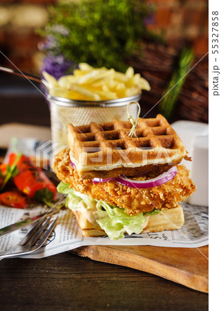Healthy breakfast with fresh hot waffles hearts, pancakes flowers