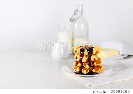 Freshly baked Belgian waffles on a white plate on a light table, copy space