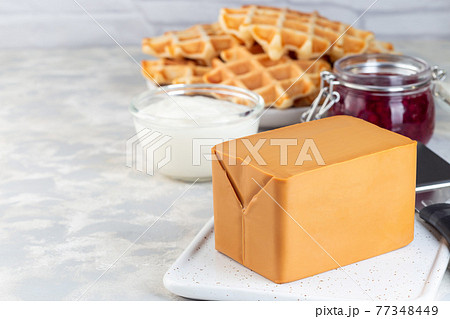 Piece of Norwegian brown cheese with waffles, lingon jam and cup of coffee, horizontal, copy space