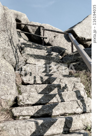 A rocky staircase with a wooden railing leads upwards, shadowed by the surrounding boulders. Hochstein, Germany