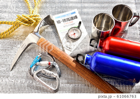 登山イメージ 山道具 登山用品 山岳装備 ピッケル カラビナ 地図 コンパス
