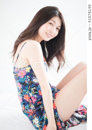 畳の上に座りくつろぐ白いキャミソール姿の若い女性