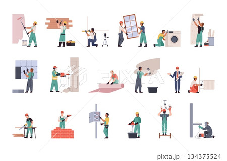 Professional construction repair man. Home renovation, people in uniform and helmets, workers in overalls, being laid, repaired and installed, build and paint tidy vector cartoon flat set