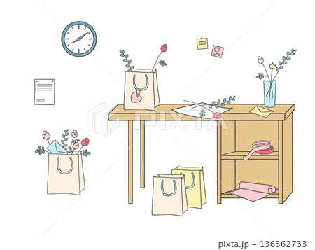 Vector illustration of a florist workspace with table, paper bags holding bouquets, notes and wall clock. Flower shop interior and order preparation concept.