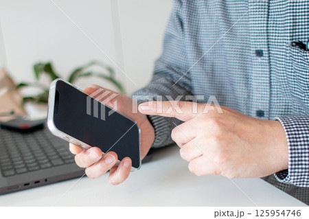 A top view of a man holding a smartphone with a white screen mockup above a desk.