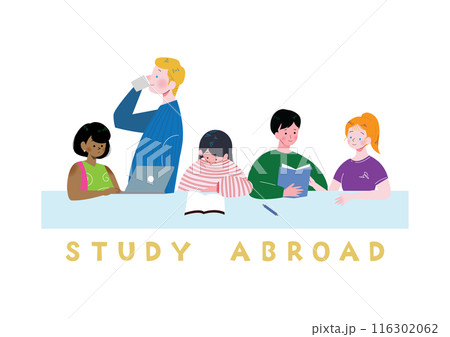 教科書を持って海外の友達と並ぶ留学生のイラスト