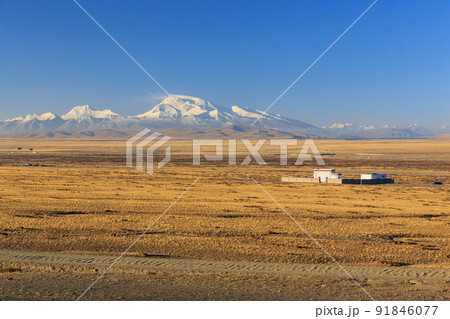 チベットの聖山・カイラス山を巡る起点の町・タルチェンから見る広大なチベット高原の風景とナムナニ峰