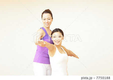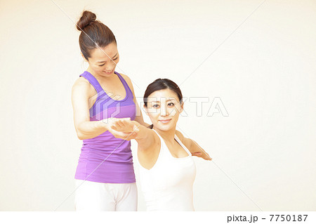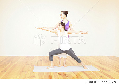 ヨガスタジオでヨガレッスンを受ける若い日本人女性とインストラクター